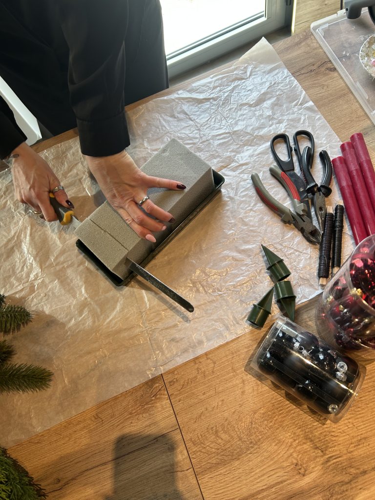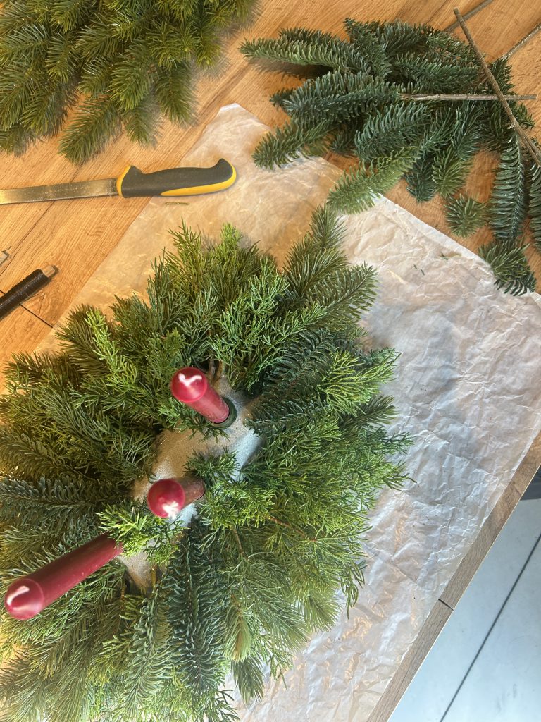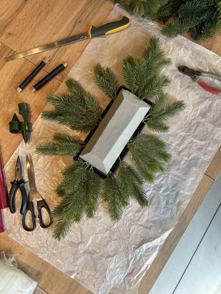 Inserisci i rami di pino ai lati lunghi della schiuma, partendo dall’esterno verso il centro. Alterna rami più lunghi nelle estremità e rami più corti nella parte superiore: in questo modo ottieni una struttura equilibrata e piacevole alla vista.